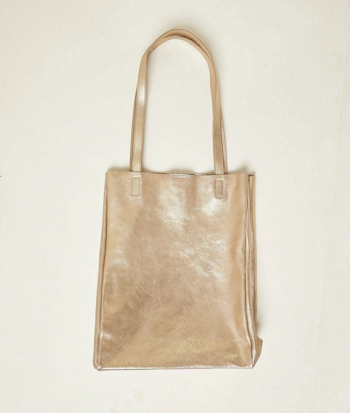 Emportez tous vos essentiels dans ce sac en cuir doré muni de grandes anses offrant un porté à l’épaule.