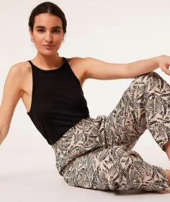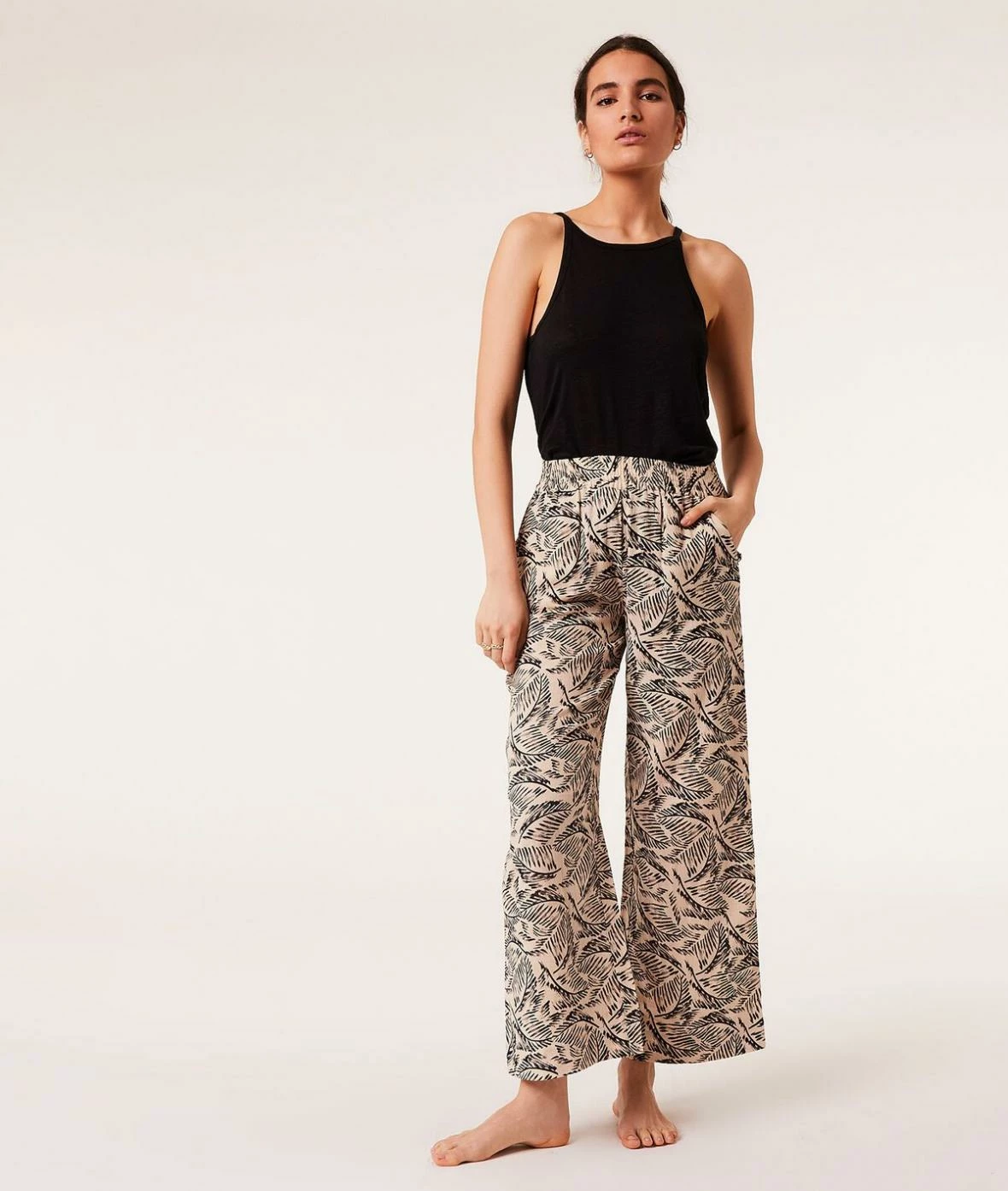 Un imprimé feuillage se dévoile sur ce pantalon larget et léger délicatement smocké à la taille.