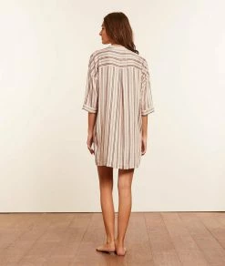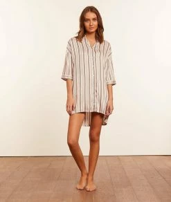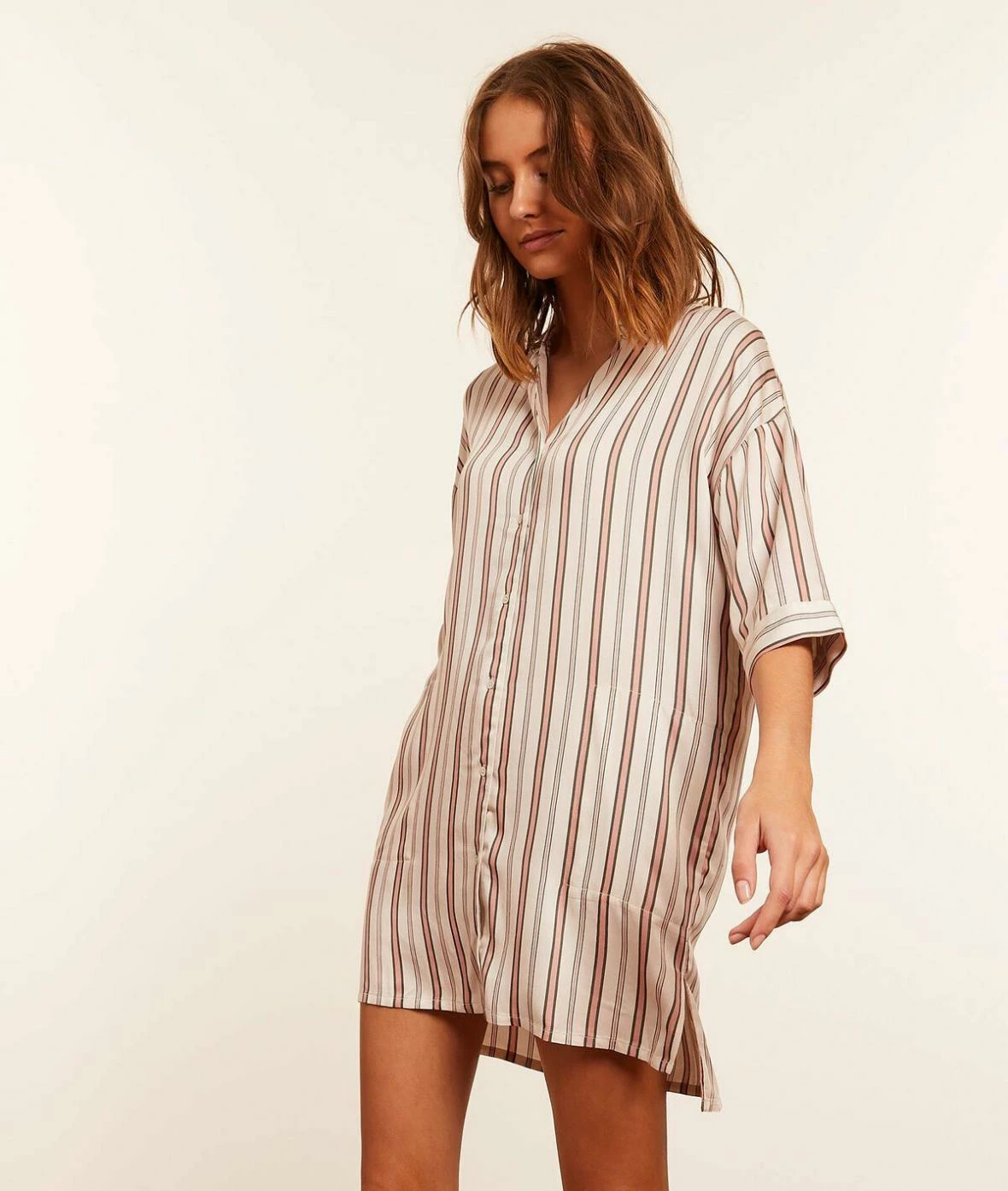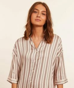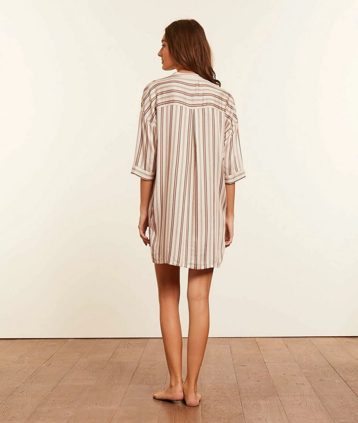 Inspirée du vestiaire masculin, cette chemise de nuit satinée munie de manches 3/4 dévoile un imprimé rayé.