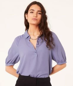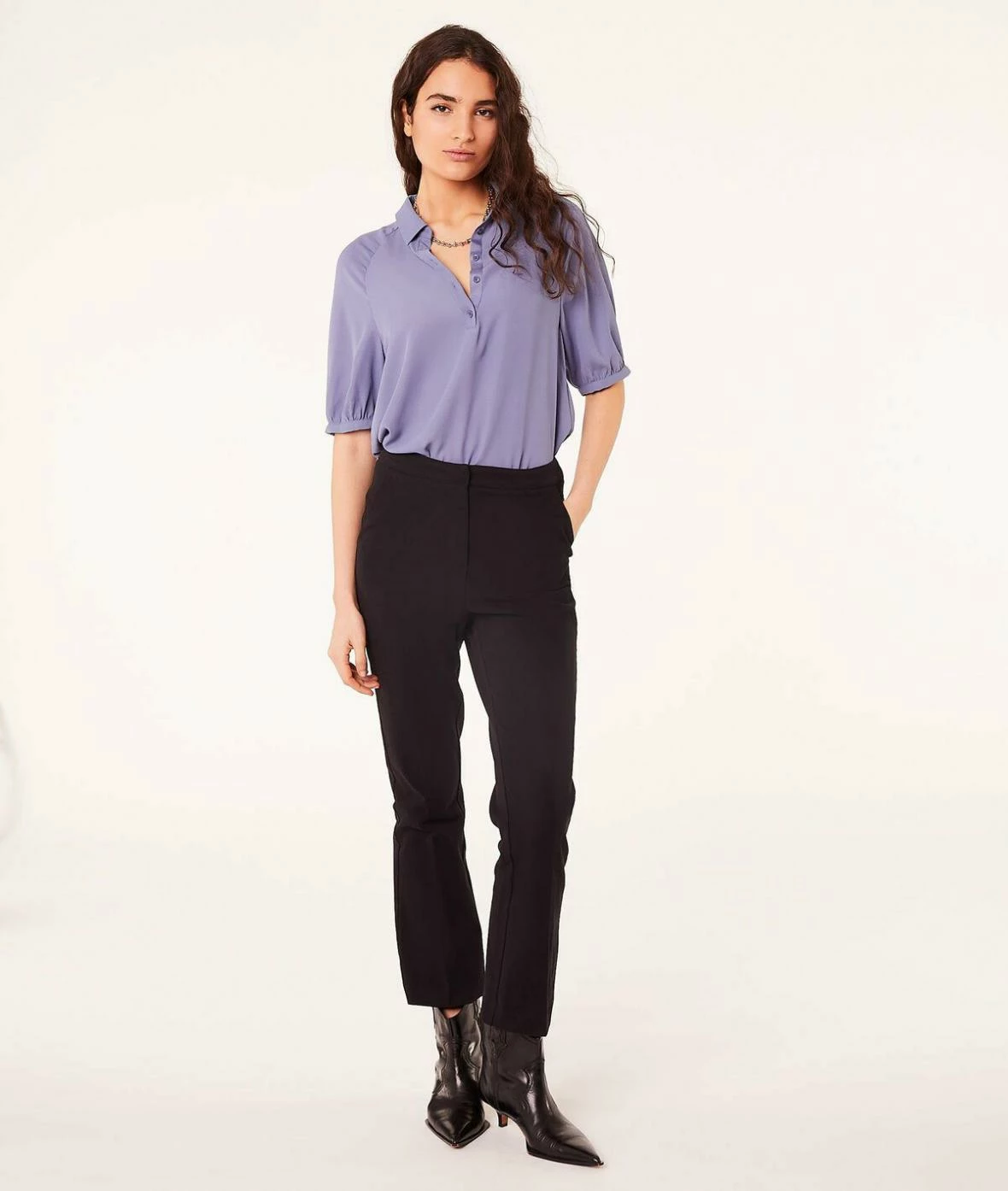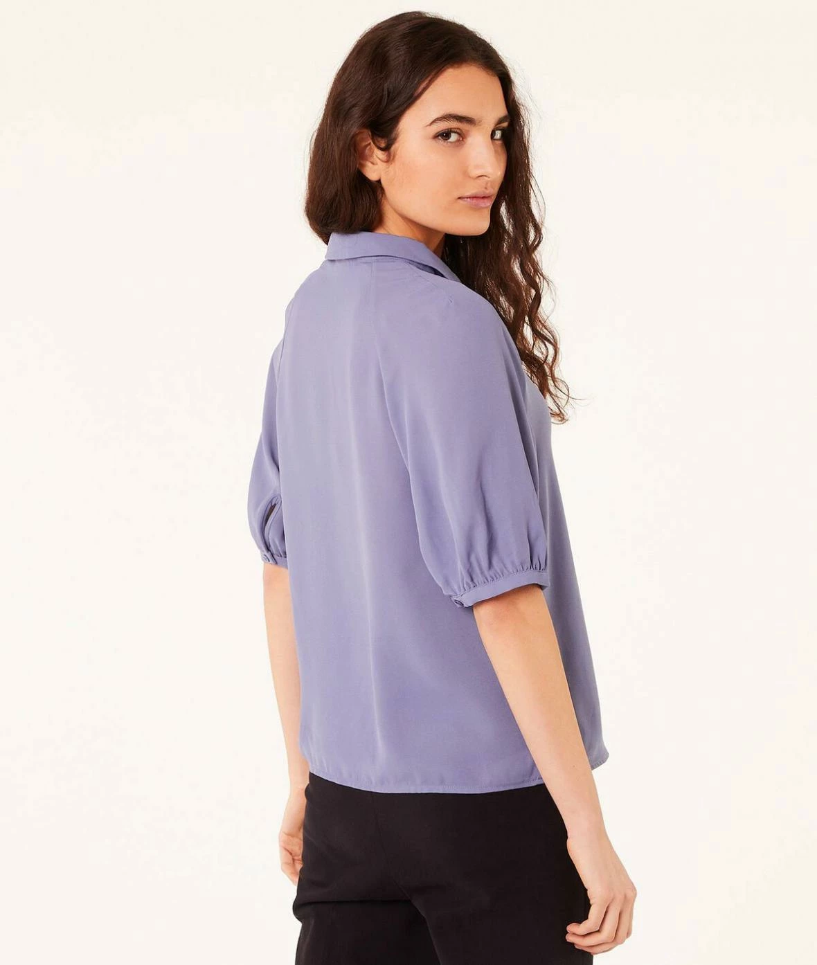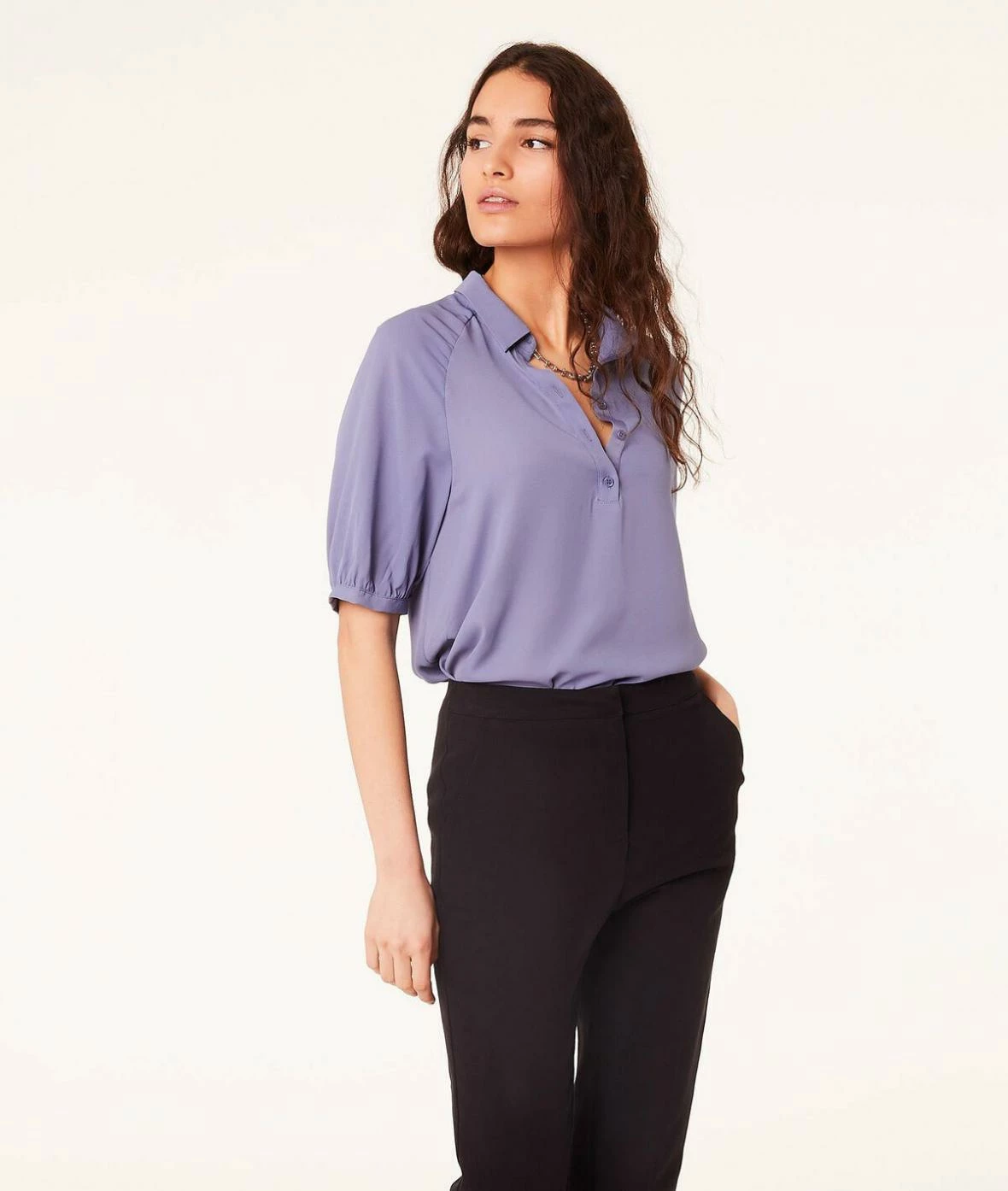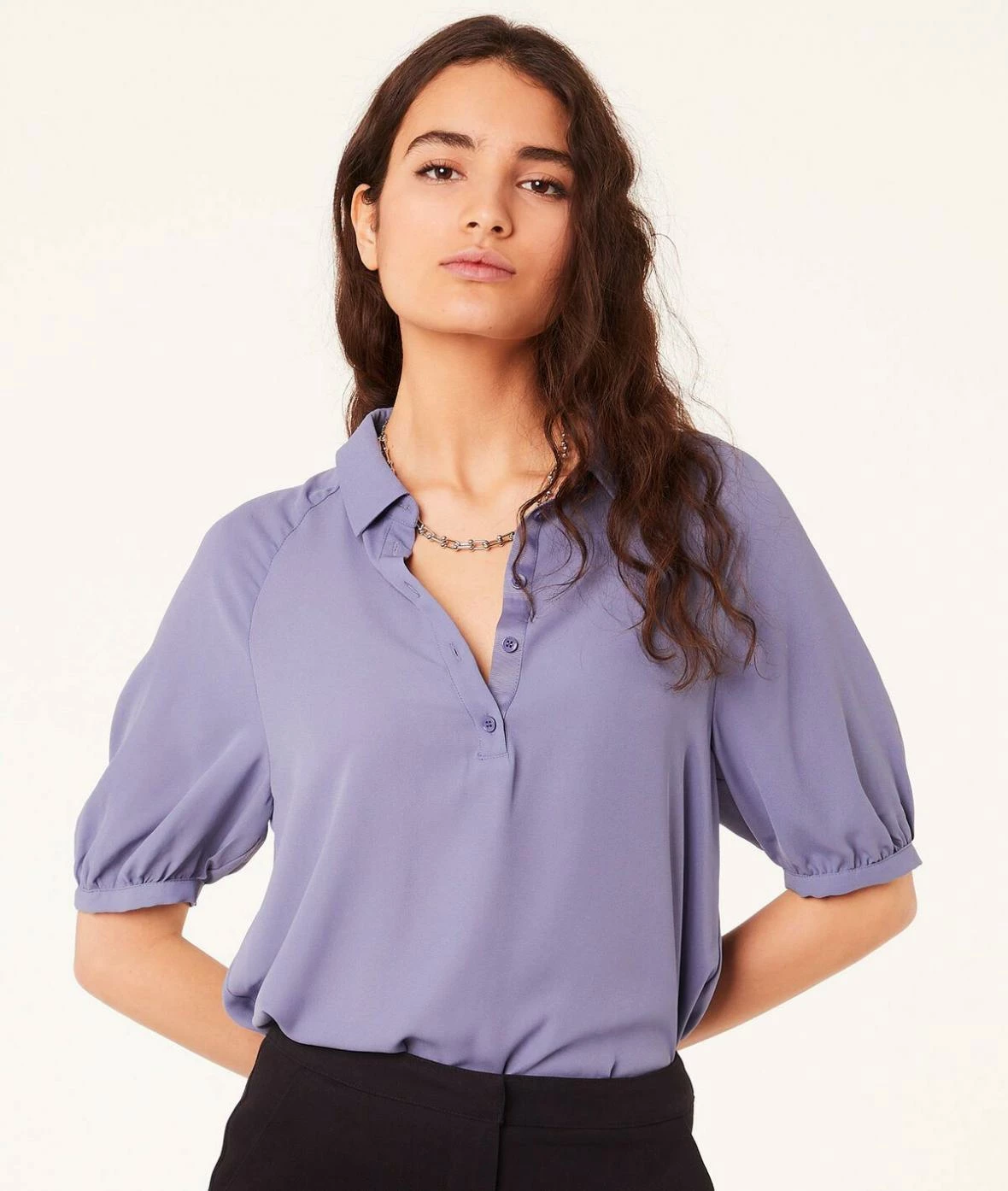 La silhouette est pleine d’allure dans ce chemisier façon polo aux manches légèrement bouffantes.