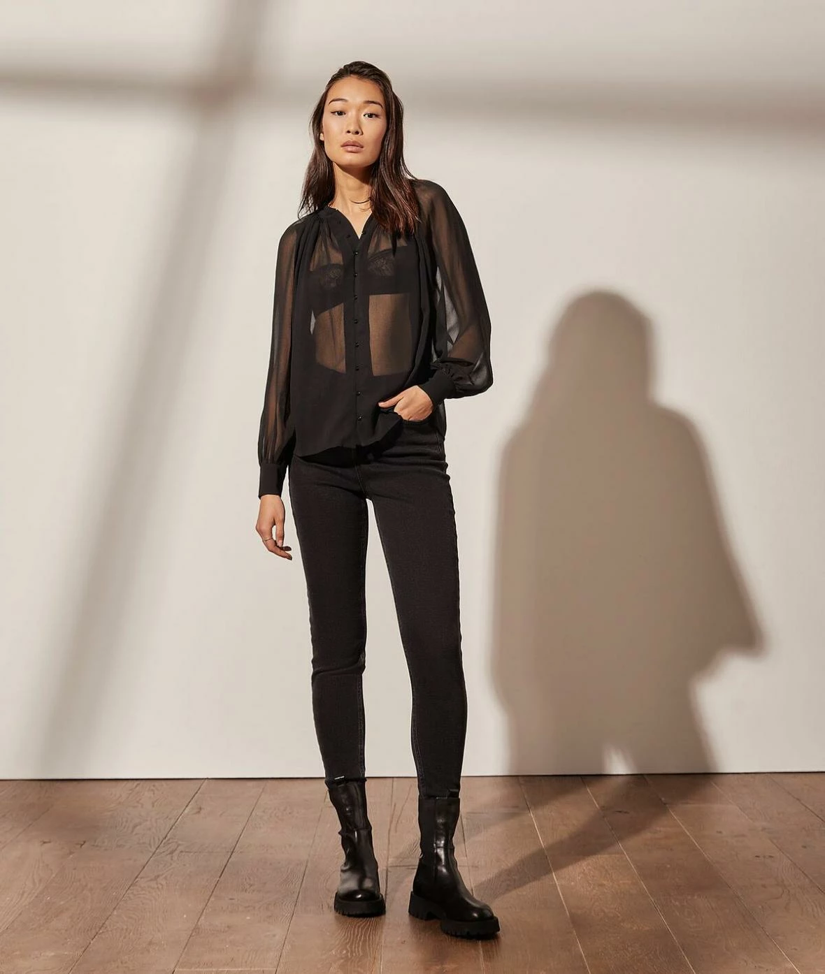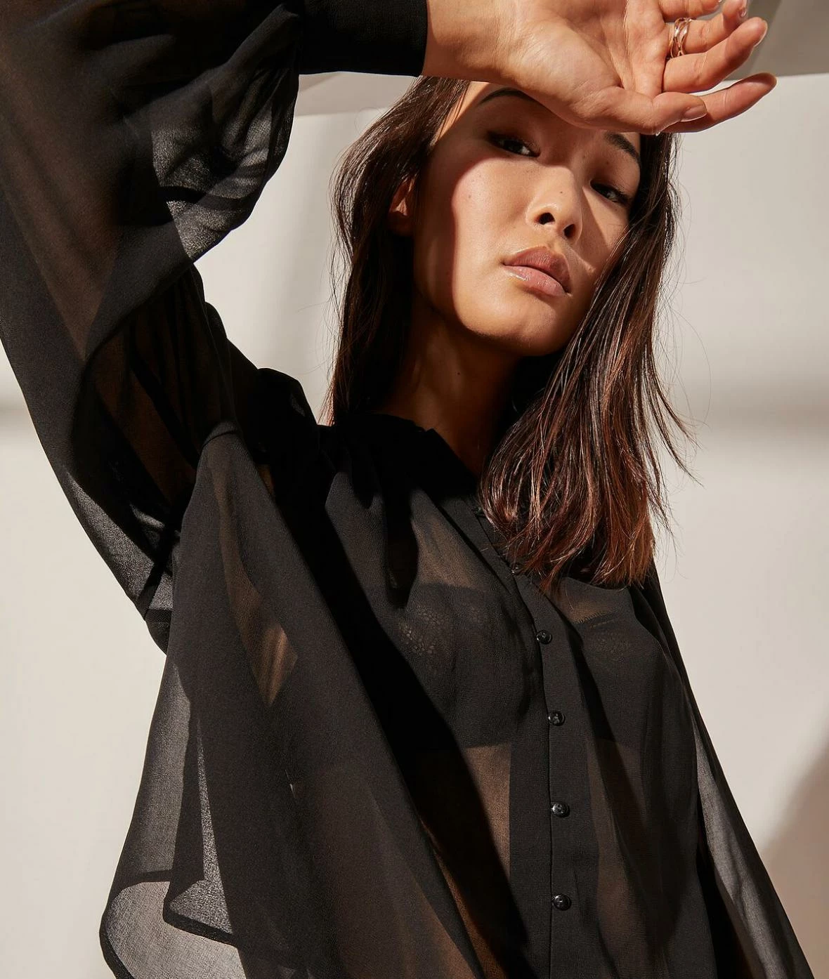 Dévoilez votre lingerie avec subtilité sous ce chemisier chic, confectionné dans un tissu semi-transparent.