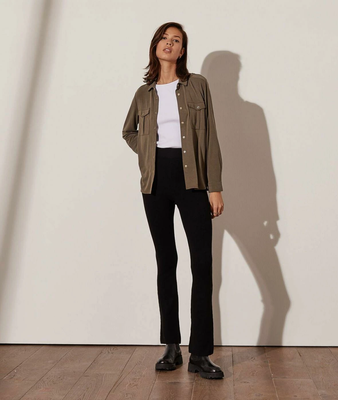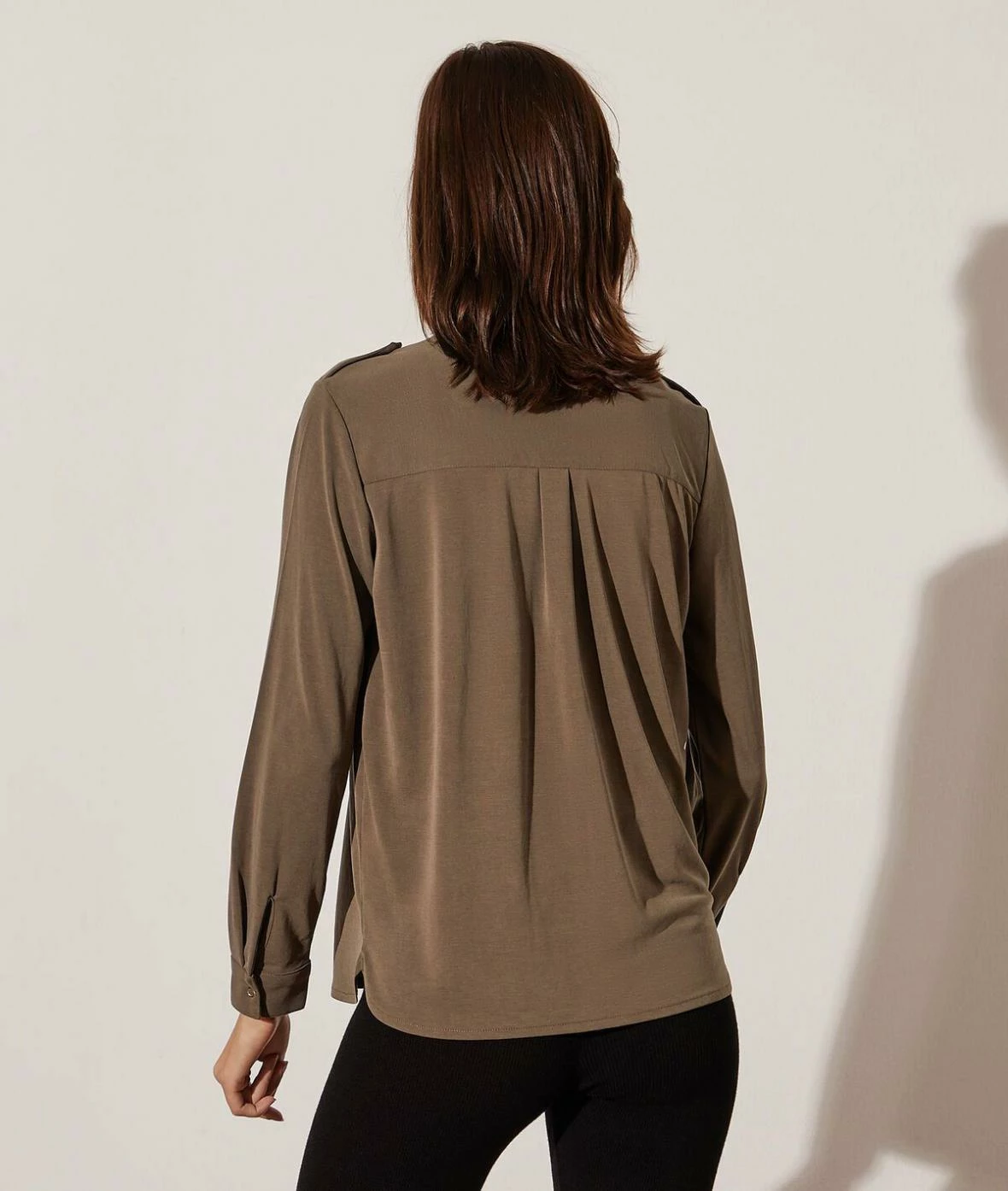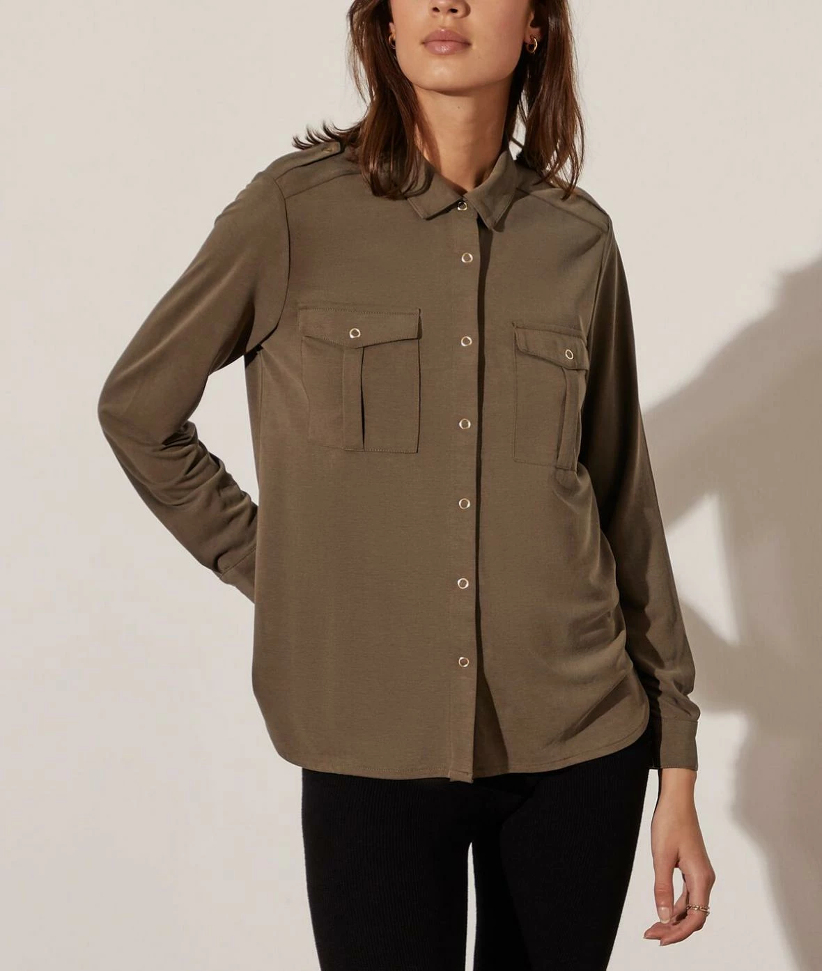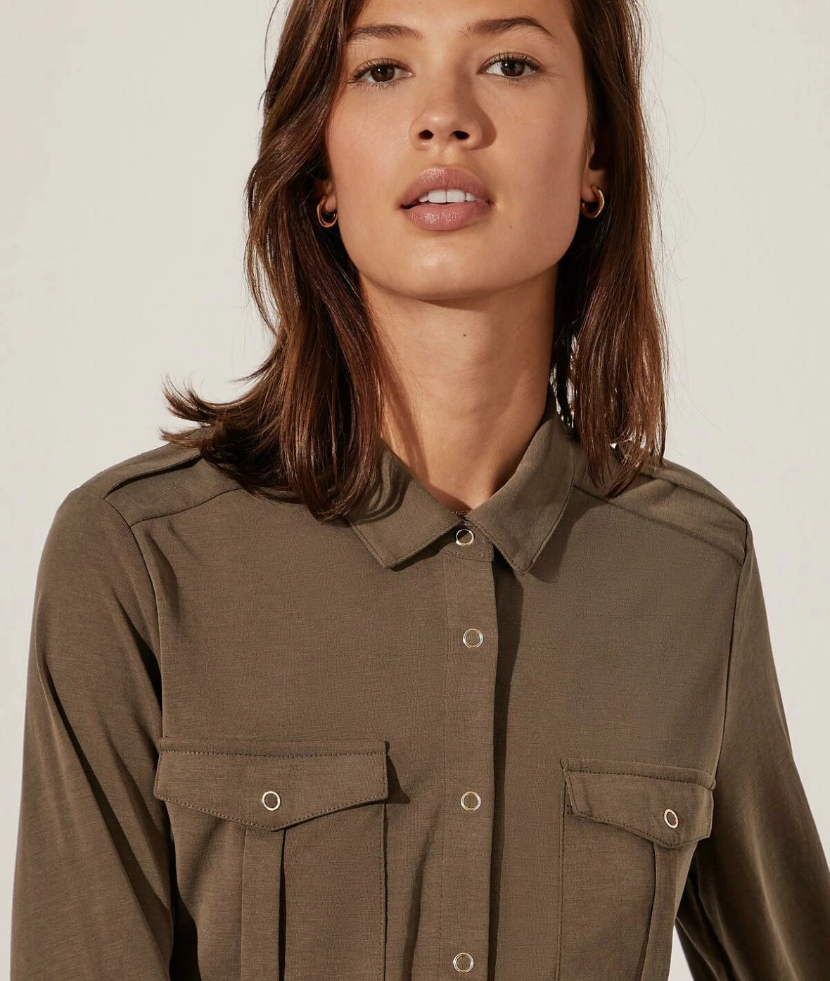 Inspiration militaire pour cette chemise fluide à porter fermée ou ouverte en surchemise.
