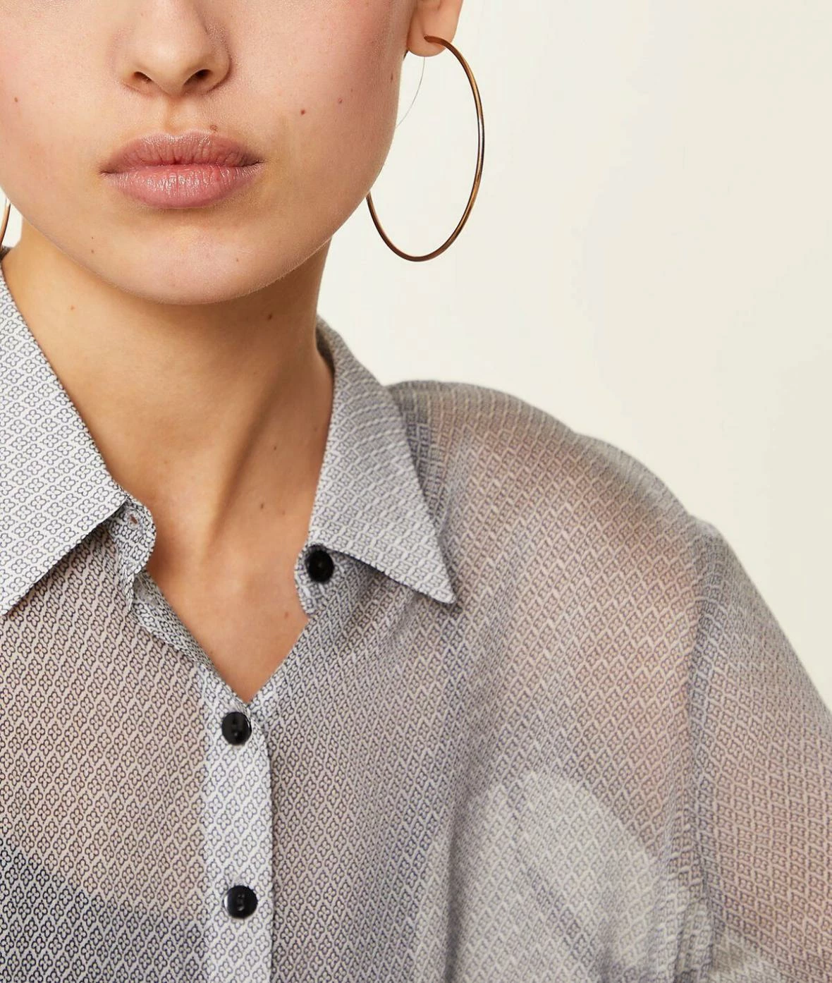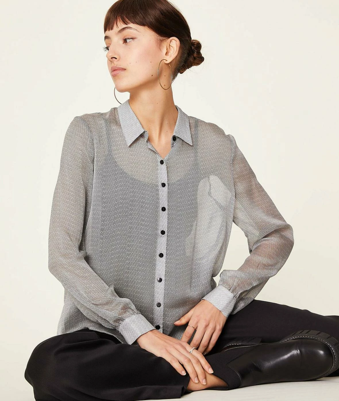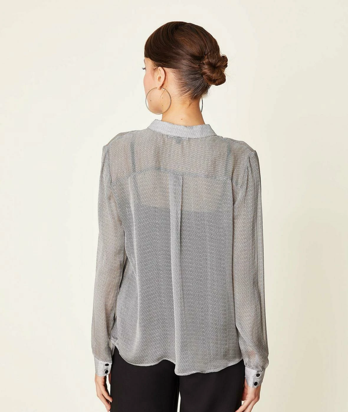 Transparence et délicatesse pour ce chemisier en mousseline de soie légère et aérienne.