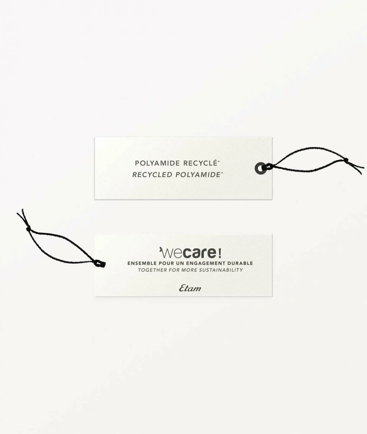 Cette dentelle contient du polyamide recyclé principalement issu de chutes de production, ce qui permet de préserver les ressources non-renouvelables et de réduire les déchets (hors finitions).