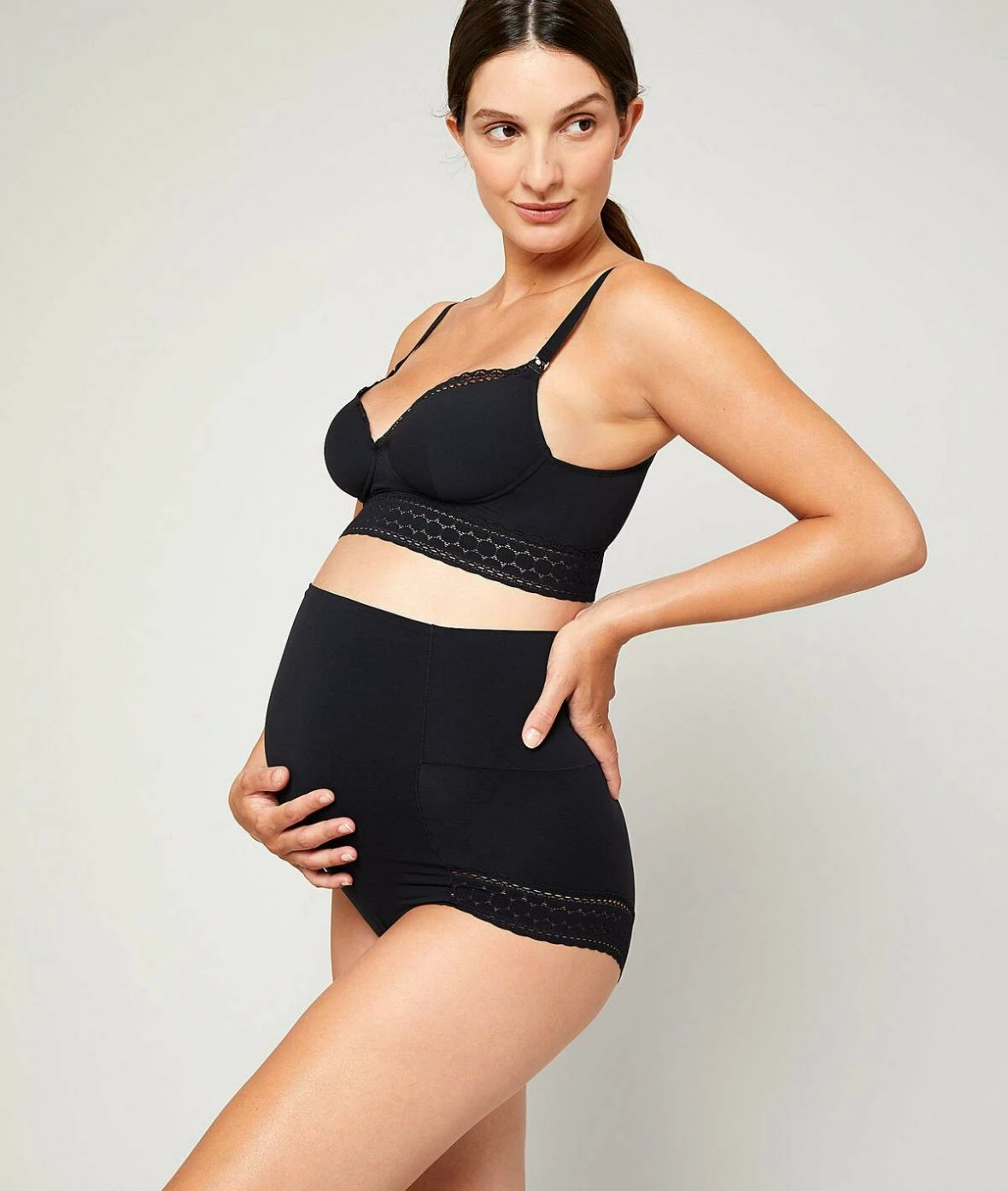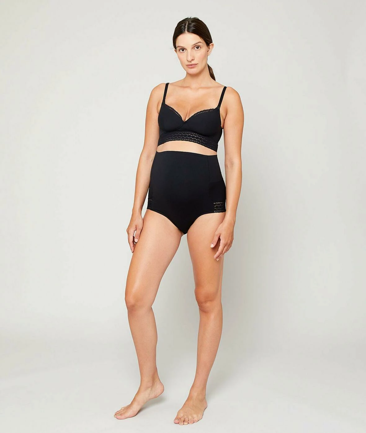Cette culotte taille haute recouvre le ventre ou se rabat pour accompagner les futures mamans en douceur tout au long de la grossesse.