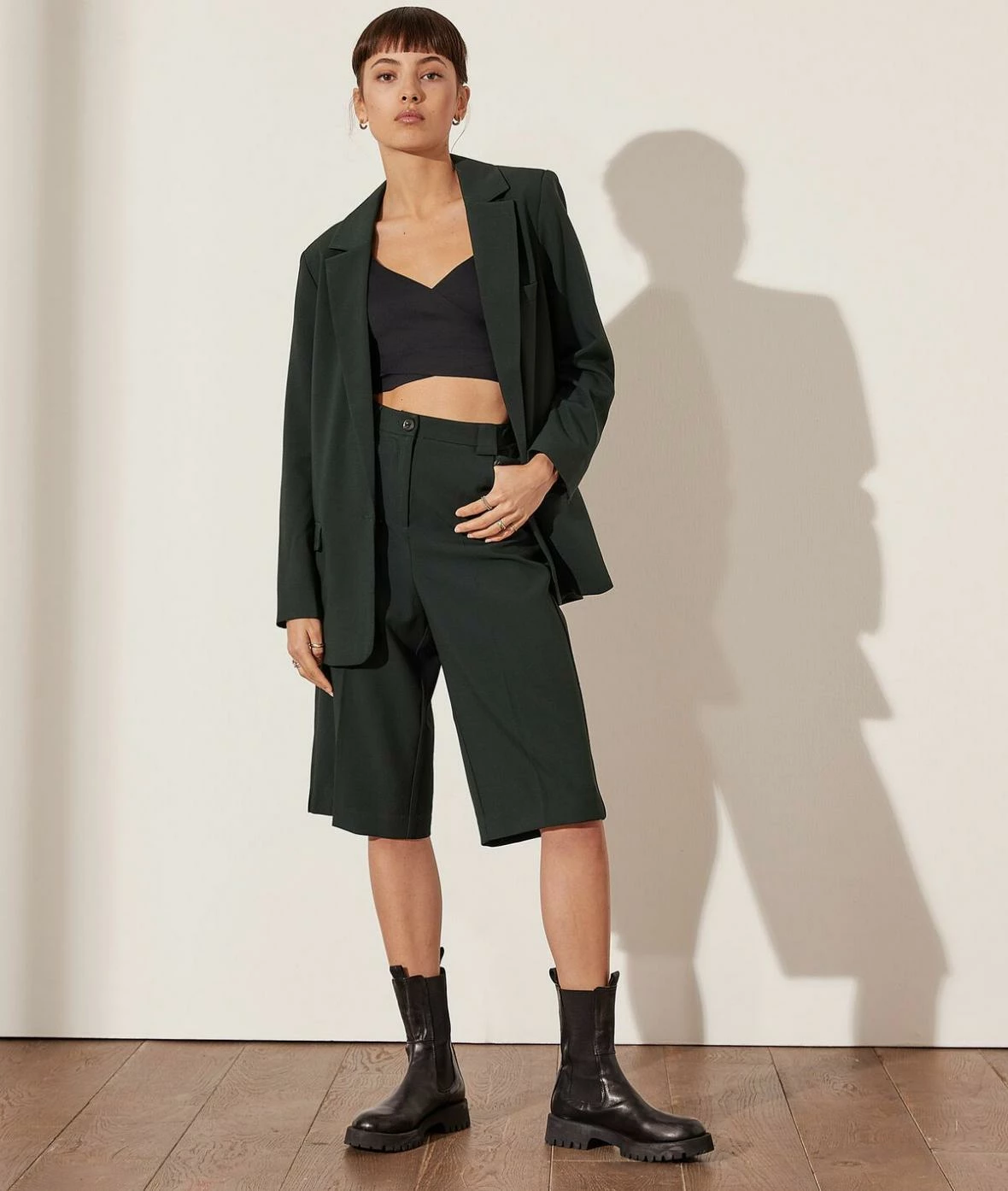 Revisitez le tailleur classique dans une version ultra tendance : un bermuda chic et subtilement satiné, à porter avec la veste coordonnée.