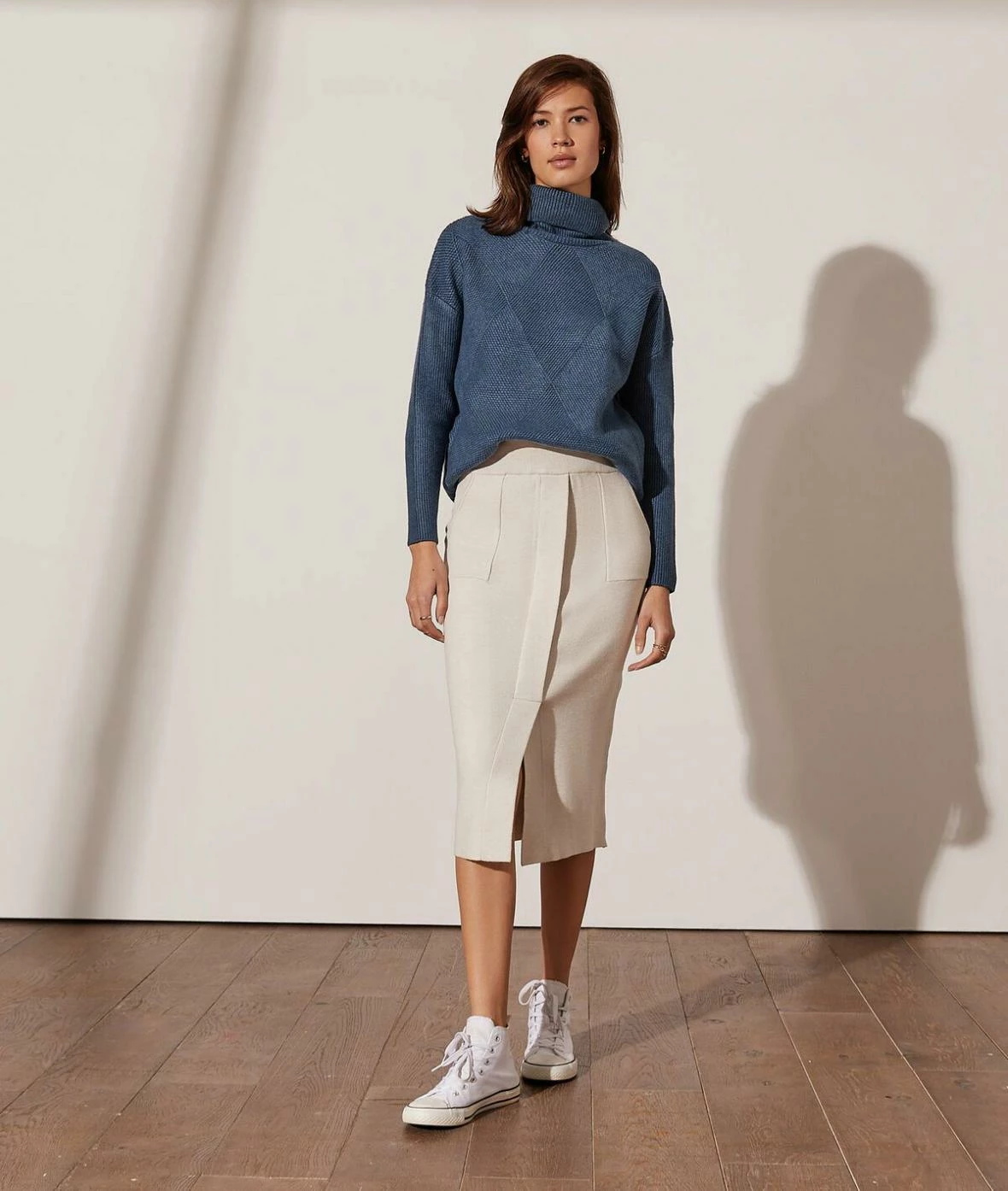 Grande tendance de la saison, la maille s’adopte en total look. Misez sur cette jupe en maille épaisse, qui galbe la silhouette avec sa forme crayon et dévoile une petite fente à l’avant ainsi que des poches plaquées sur les cotés.