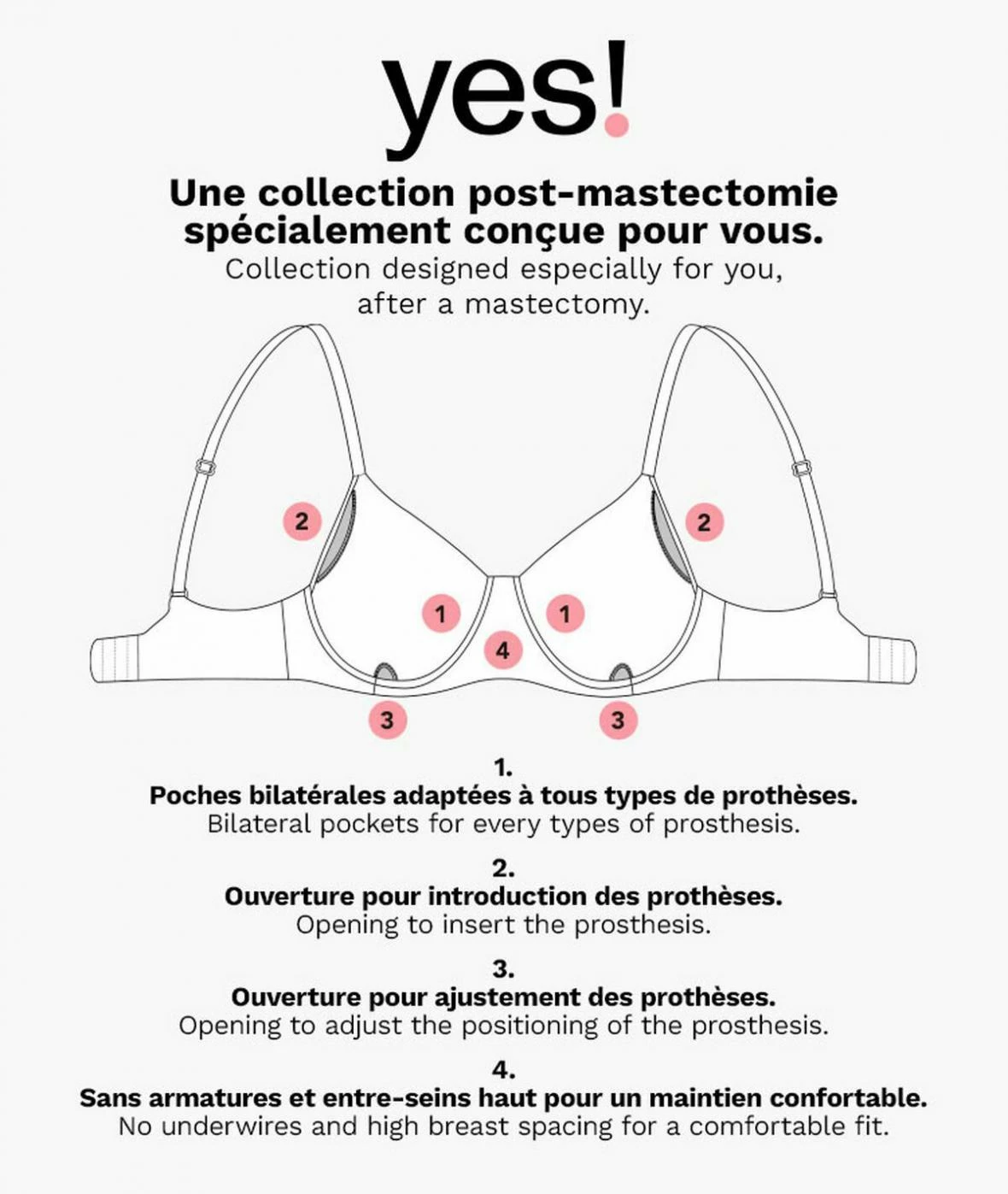 Parce que nous nous sommes donnés pour mission d’accompagner toutes les femmes, tout au long de leurs vies dans les plus beaux moments comme dans les épreuves, nous lançons YES! , notre première collection de soutiens-gorge et maillots de bain spécialement conçus pour les post-mastectomies.