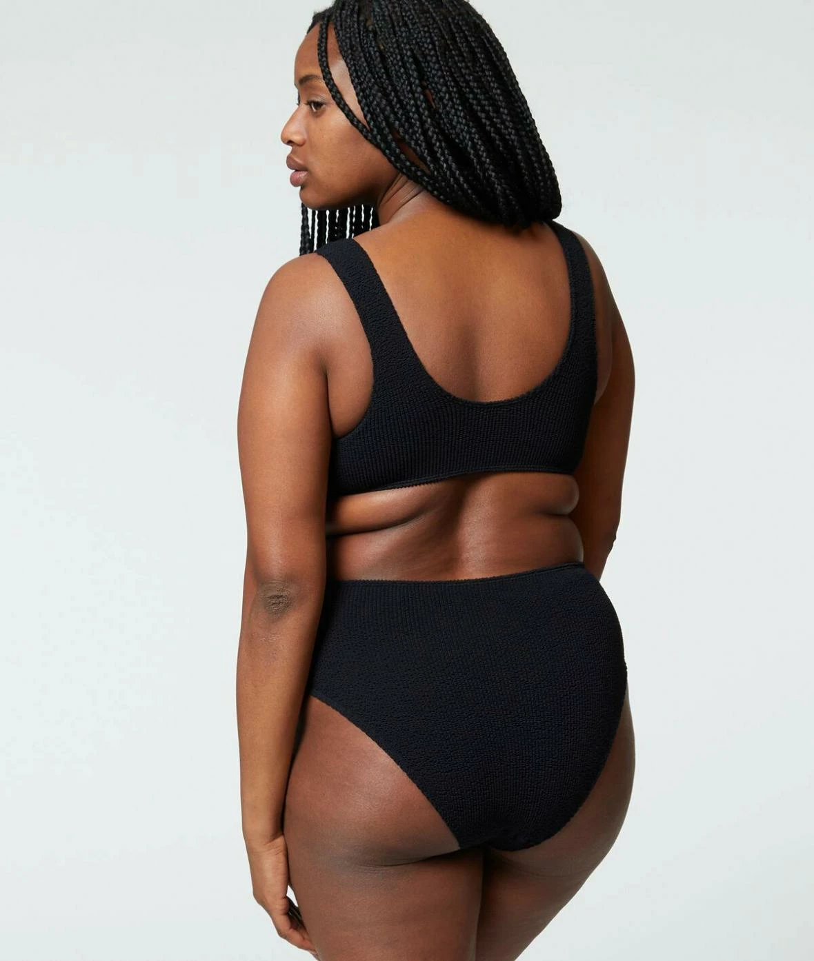 Un bikini à l’esprit sporty et à la matière texturée extensible, à porter plus ou moins remontée sur les hanches pour un effet high legs.