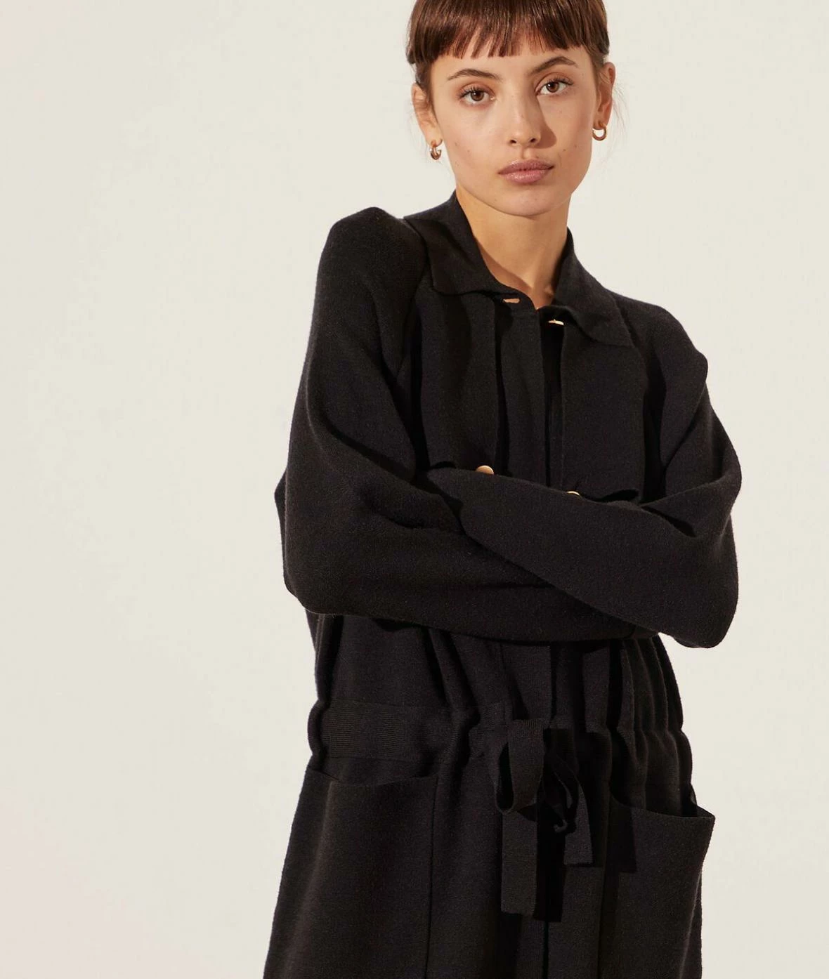 Maille fine et douce pour ce manteau à la forme singulière qui revisite le trench dans une matière inédite.