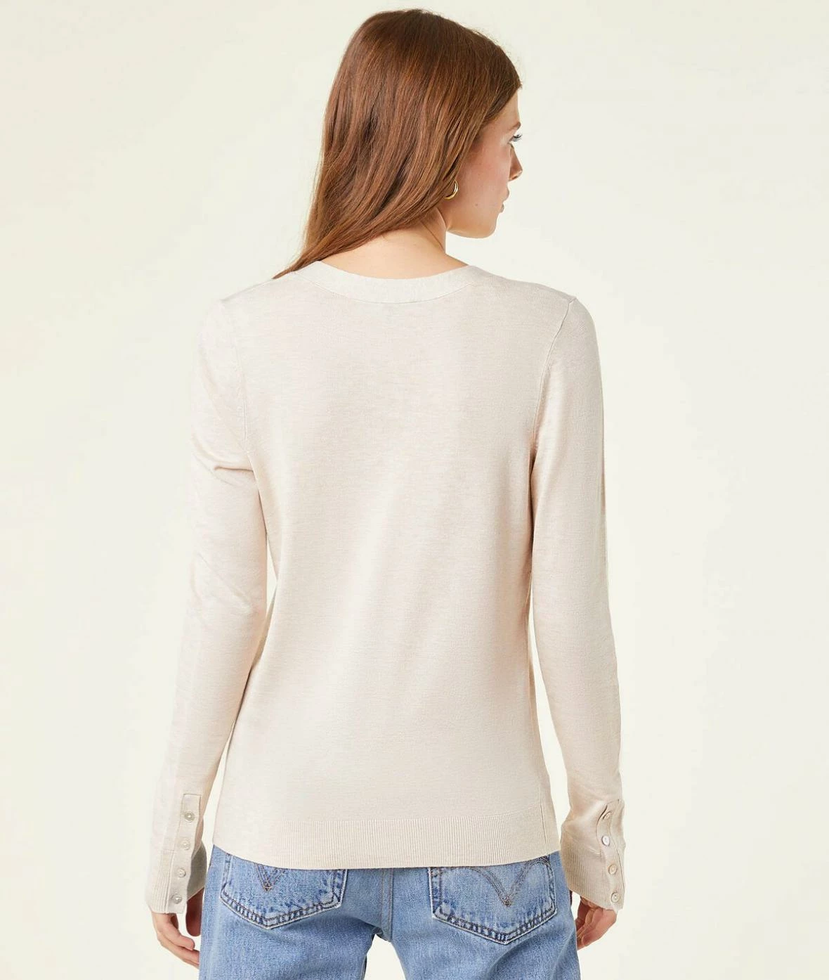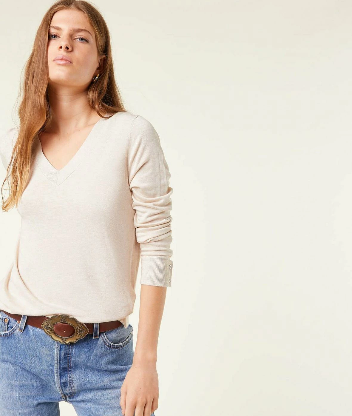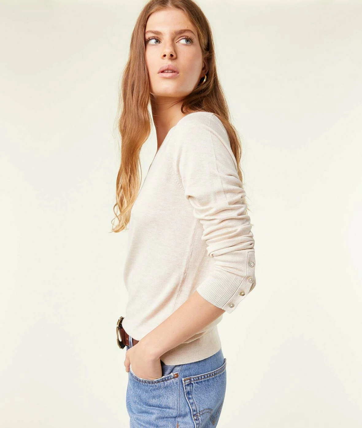 Dans votre vestiaire, misez sur des basiques doux et chics comme ce pull à maille fine et au décolleté en V, qui dévoile des poignets boutonnés.
