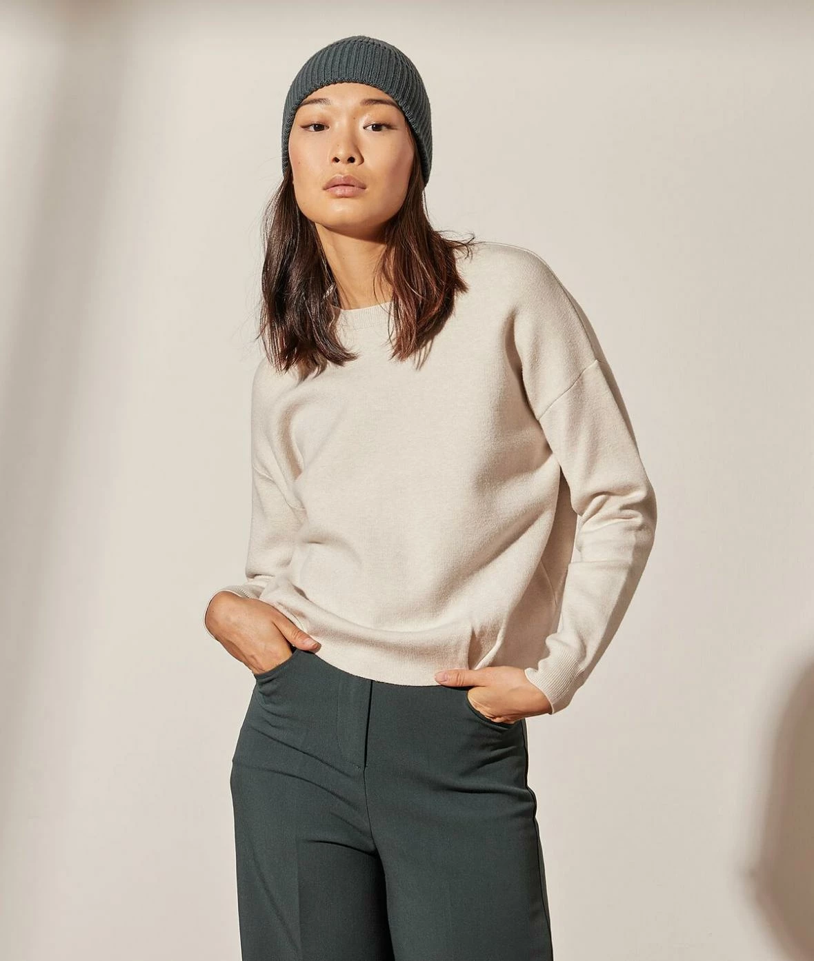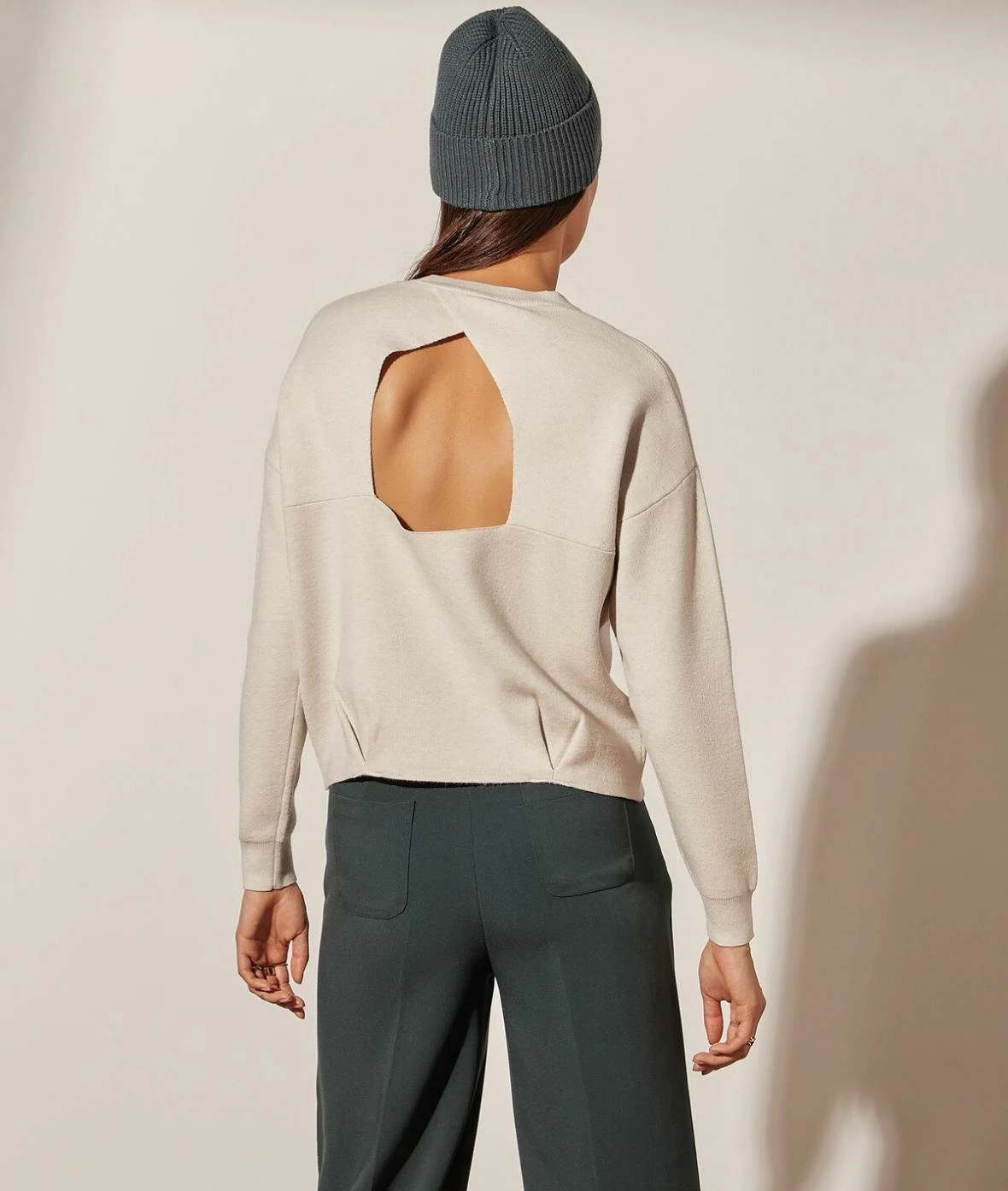 Délicatement ajouré au dos, ce pull en maille douce dévoile une forme résolument moderne.