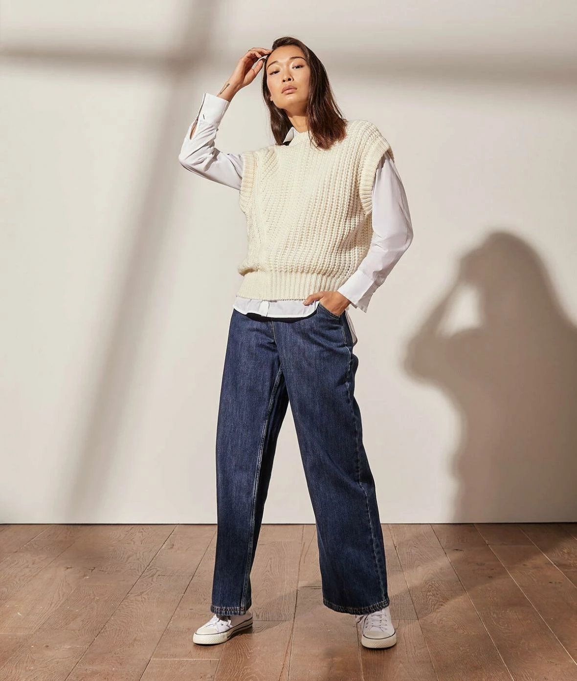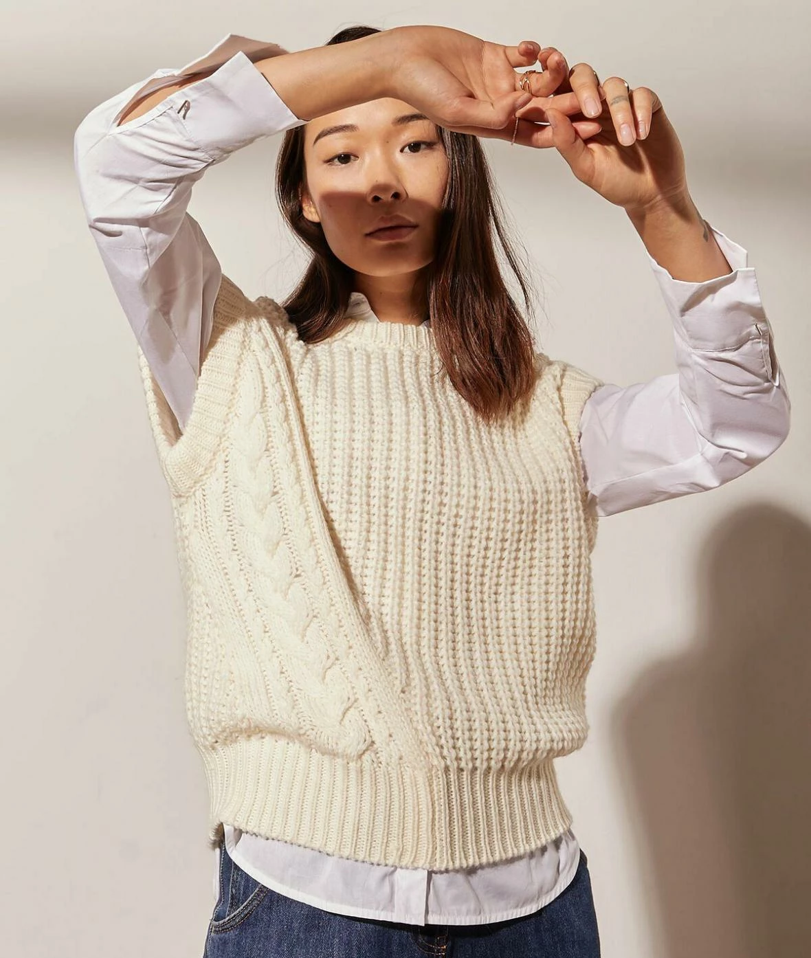 Maille douce et graphique pour ce pull sans manches à superposer à une chemise pour un look casual chic.