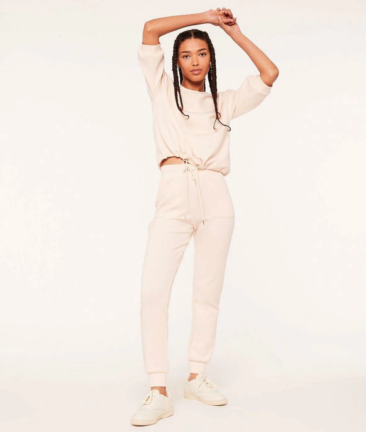 Sporty et casual, le sweat dévoile une forme tendance à resserrer à la taille avec un cordon.