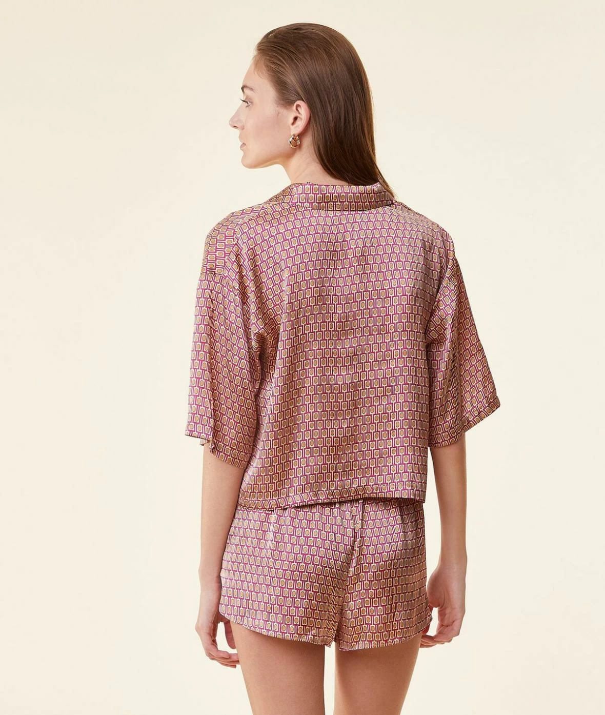 Douce et légère, cette chemise de pyjama délicatement satinée s’accorde avec le short assorti… Pour un total look.