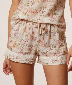 Imprimé fleuri et galons de dentelle pour ce short léger qui promet de jolies nuit d’été