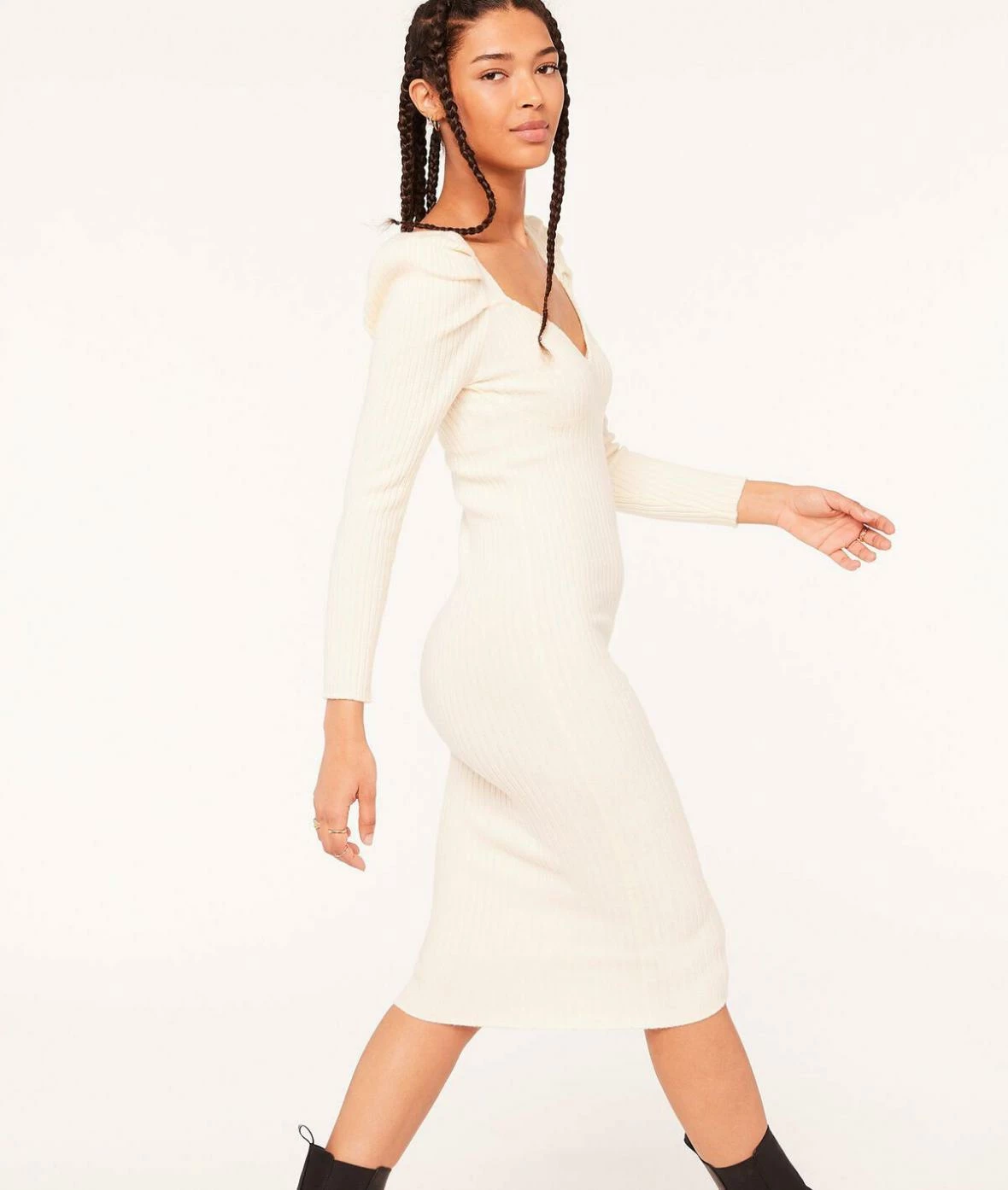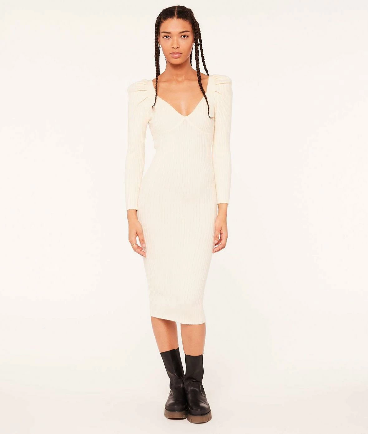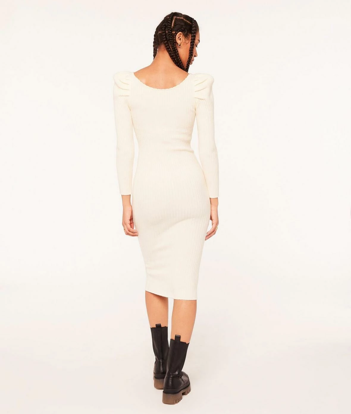 Les volumes sont revisités dans cette robe mi-longue en maille côtelée : épaules oversized et coupe près du corps.