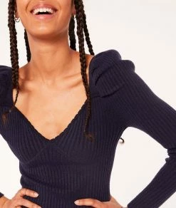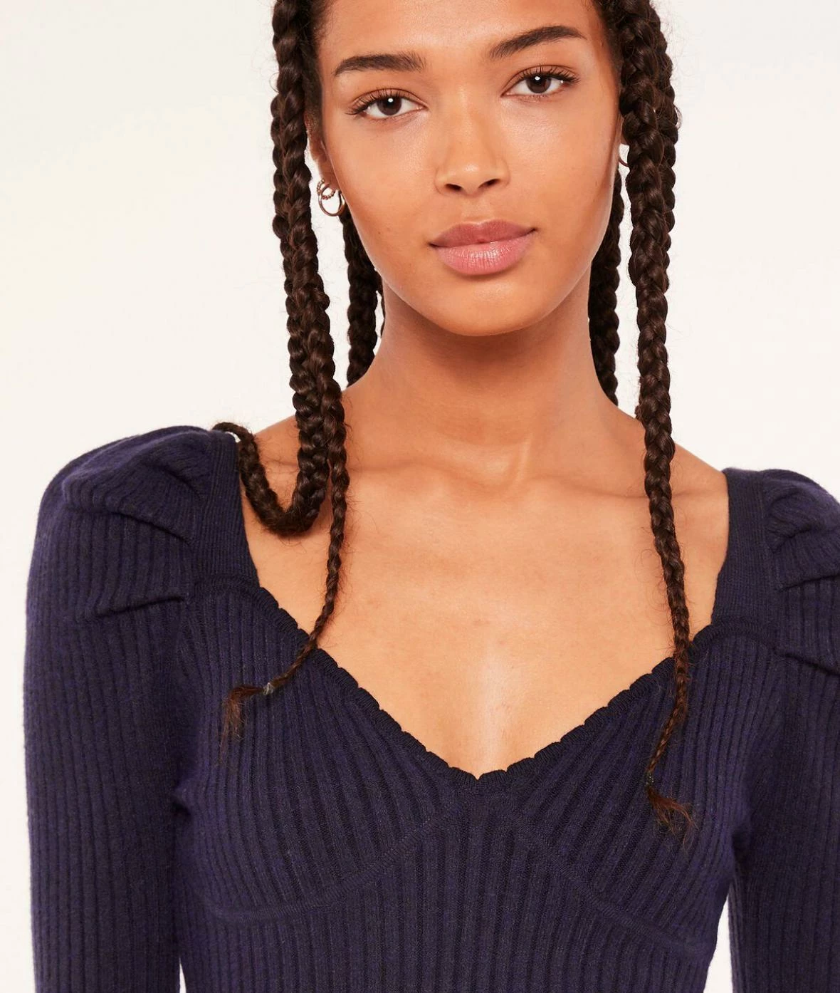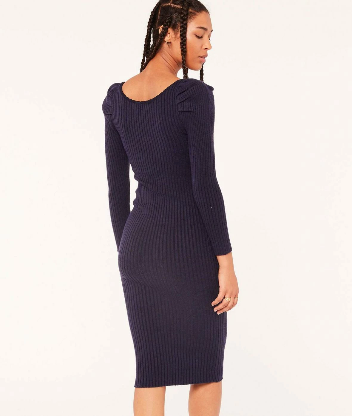 Les volumes sont revisités dans cette robe mi-longue en maille côtelée: épaules oversized et coupe près du corps.
